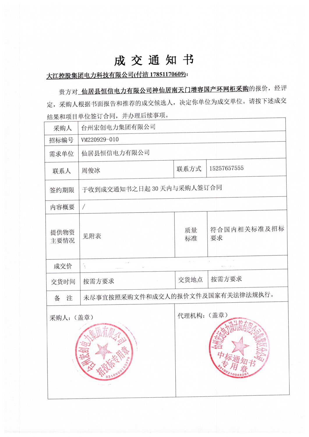 2022年10月9日,我公司在宏創集團2022年9月第五批物資采購中,憑借過硬的產品質量,紮實高效的工作作風、卓越的團隊服務和良好的企業信譽,以絕對的優勢順利中標,項目單位為:仙居縣恒信電力有限公司,中標物資為:環網櫃包1標段。