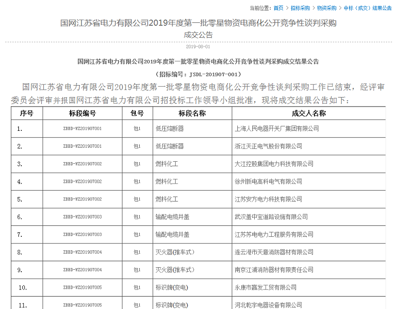 恭喜我司中標國網江蘇省電力有限公司2019年度第一批零星物資