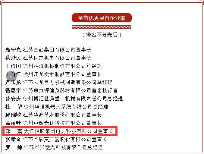 市委書(shu) 記、市人大常委會(hui) 主任周鐵根,市政協主席王安順等市領導出席,我司董事長鄭震先生被授予徐州市“優(you) 秀民營企業(ye) 家”榮譽稱號。