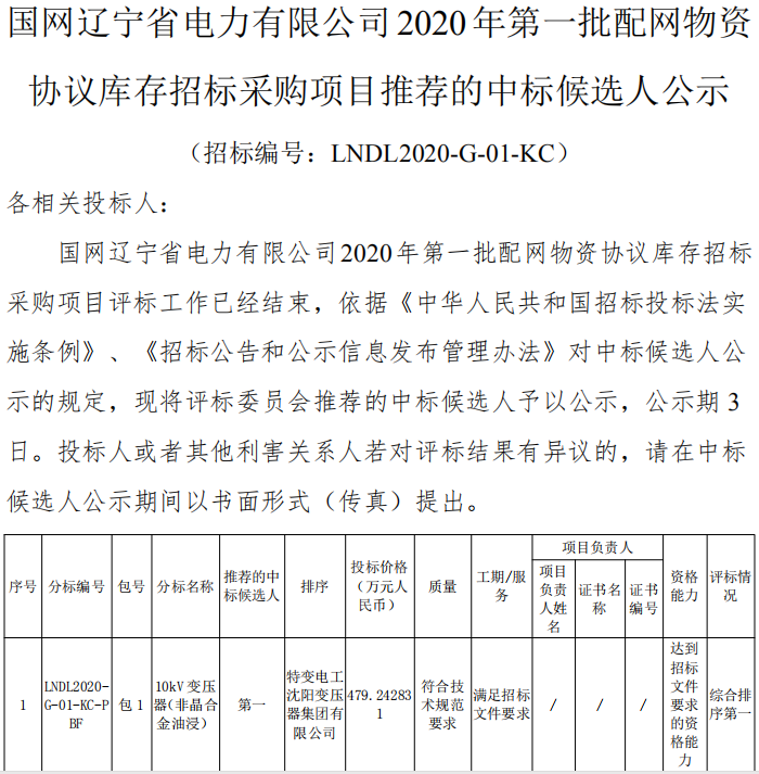 恭喜我司中標國網遼寧省電力有限公司2020年第一批配網物資協議庫存招標采購項目