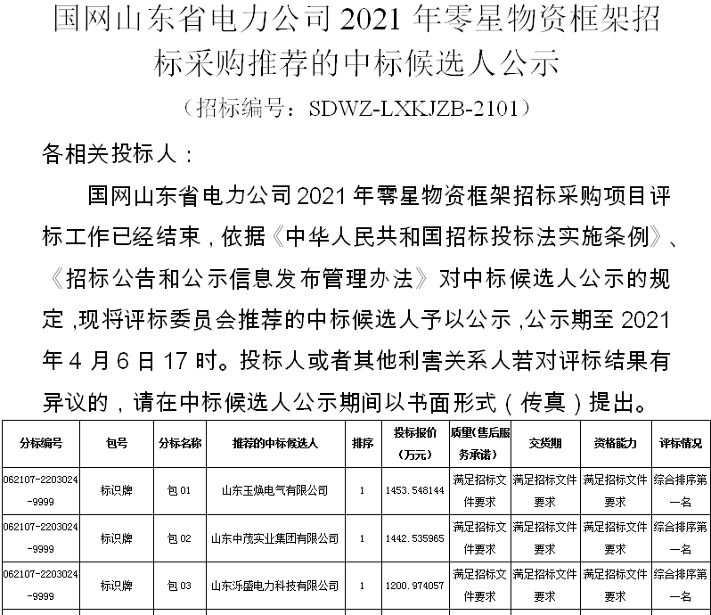 恭喜我司中標國網山東省電力公司2021年零星物資
